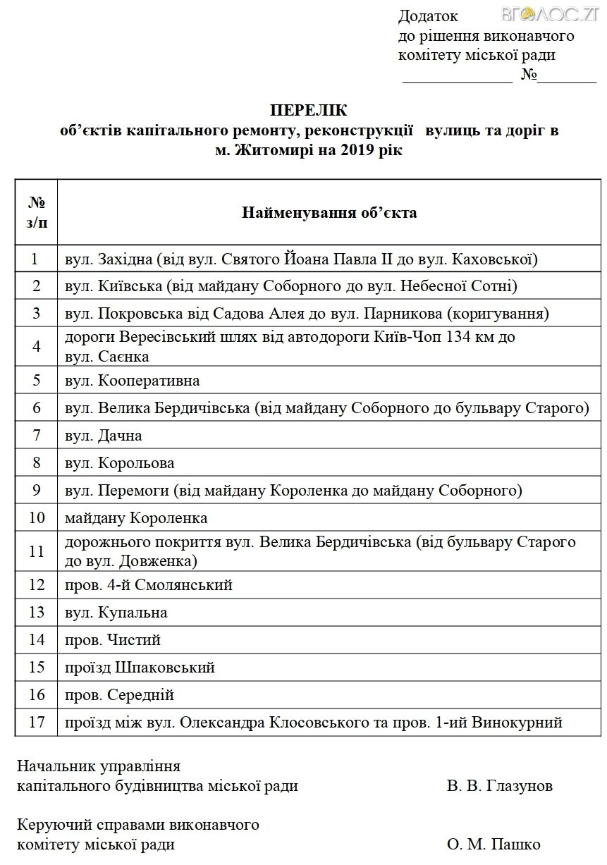 Про суму, яку планують виділити на ремонт вулиць, у документі не йдеться. Капітально відремонтувати або реконструювати планують вулиці та провулки у практично всіх частинах Житомира. До списку потрапила також дорога до села Вереси, яке минулоріч приєдналося до обласного центру. Її збираються відремонтувати по всій протяжності до вулиці Саєнка у Житомирі.