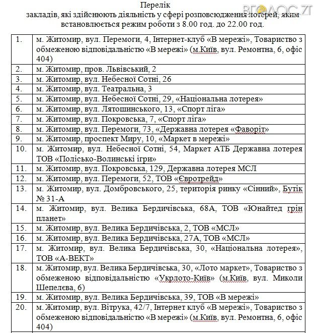 Як повідомляв “Вголос.zt”, Житомирський міськвиконком на позачерговому засіданні 24 січня своїм рішенням заборонив закладам, які розповсюджують лотерею, працювати у нічний час та встановив режим роботи з 8 до 22 год. У Житомирі функціонує 44 такі об’єкти, на деякі з них житомиряни скаржаться постійно.