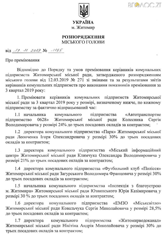 Міський голова Житомира Сергій Сухомлин преміював 12 керівників комунальних підприємств за 3 квартал 2019 року. Відповідне розпорядження оприлюднили на сайті мерії.