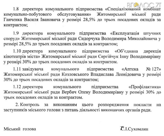 Згідно із розпорядженням, 7 посадовців отримали 30% до трьох посадових окладів. Серед них — директор КП «Житомирводоканал» Андрій Нікітін, начальник КП «Інспекція з благоустрою» Юрій Юзвінський, директор КП «Парк» Ігор Леонченко та вже екс-керівниця КП «Об’єднана дирекція кінотеатрів міста» Інна Сергійчук.