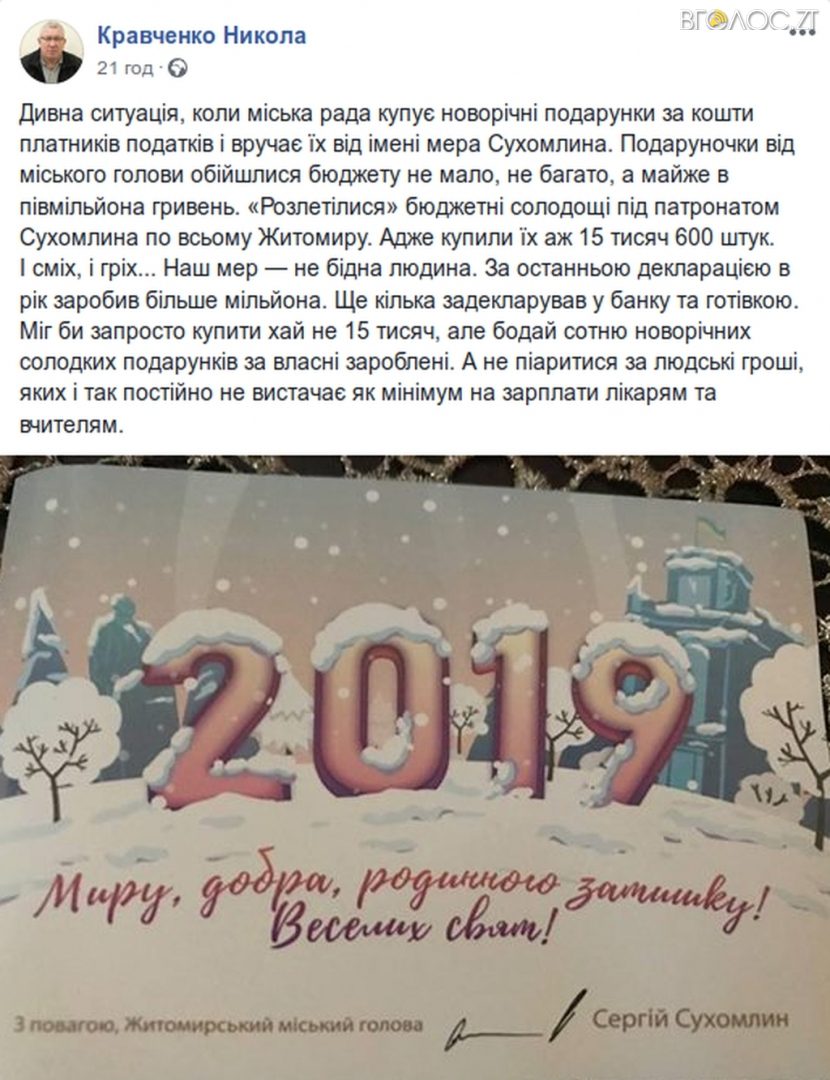 «Дивна ситуація, коли міська рада купує новорічні подарунки за кошти платників податків і вручає їх від імені мера Сухомлина. Подаруночки від міського голови обійшлися бюджету не мало, не багато, а майже в півмільйона гривень. «Розлетілися» бюджетні солодощі під патронатом Сухомлина по всьому Житомиру. Адже купили їх аж 15 тисяч 600 штук», – написав на своїй сторінці у Facebook житомирянин Микола Кравченко.