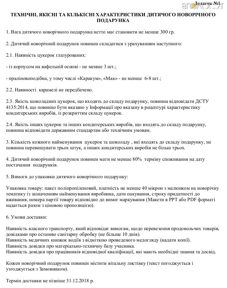 За тендерною документацією, маса нетто кожного подарунка має становити не менше 300 г.