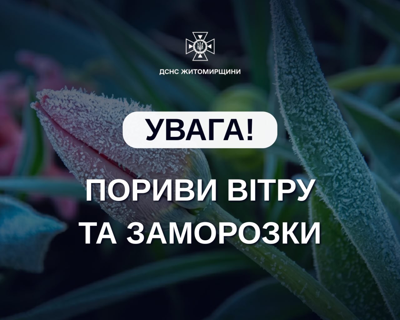 За даними Житомирського обласного центру з гідрометеорології завтра вранці та вдень 26 квітня в нашому регіоні очікуються пориви вітру 15-20 м/с. ( І рівень небезпечності – жовтий). Також 27-28 квітня очікується різке зниження температури: у повітрі заморозки 0–2° (ІІ рівень небезпечності, помаранчевий).