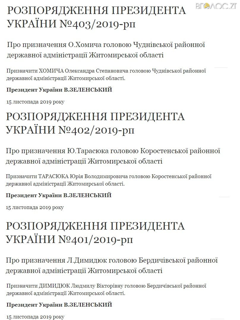Зеленський призначив голів трьох РДА на Житомирщині.