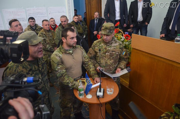Чоловіки у військовій формі заблокували трибуну та вимагали звільнення Сухомлина