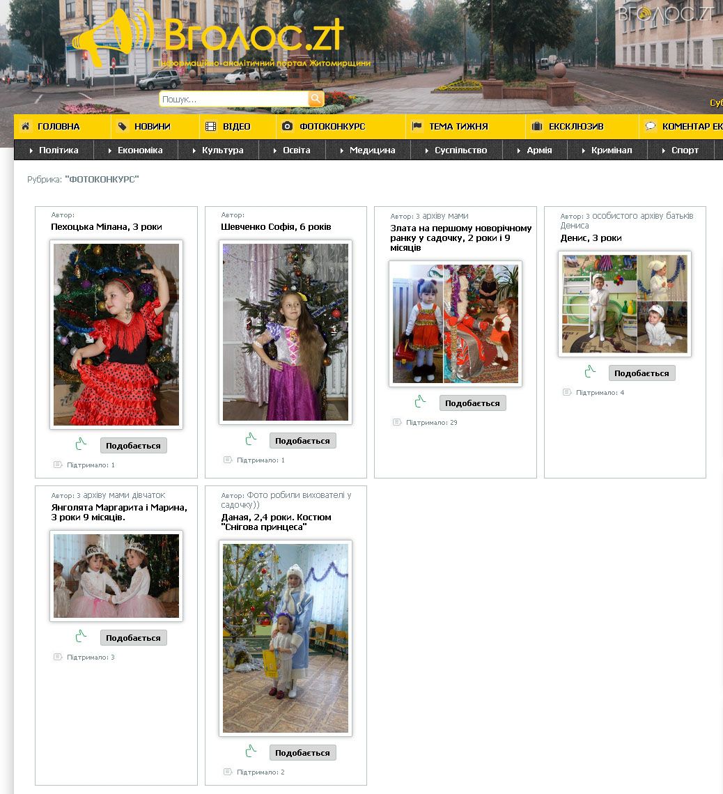 До 18 січня на порталі «Вголос.zt» триватиме голосування, щоб визначити переможця фотоконкурсу «Кращий дитячий новорічний костюм». Участь у змаганні беруть семеро маленьких жилетів області. На конкурсних світлинах малюки перевтілилися на зайчиків, тигренят, казкових принцес та інших персонажів.