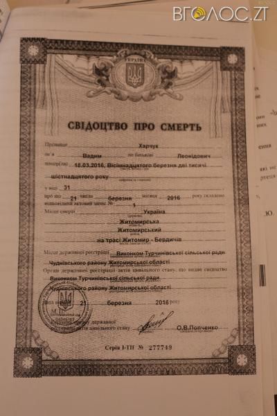 Той факт, що чоловіка вивезли з місця трагедії, підтверджує й свідоцтво про смерть. У графі «місце смерті» чорним по білому написано: «Житомирська область, Житомирський район, на трасі Житомир-Бердичів».