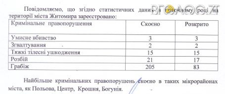 «На території міста Житомира цьогоріч було зареєстровано 3 умисних вбивств, 15 фактів спричинення тяжких тілесних ушкоджень, 2 зґвалтування, 21 розбійний напад, 205 фактів пограбування громадян. Зокрема, не розкритими залишилися 122 грабежі та 4 розбійних нападів», – повідомив Михайло Сорока.