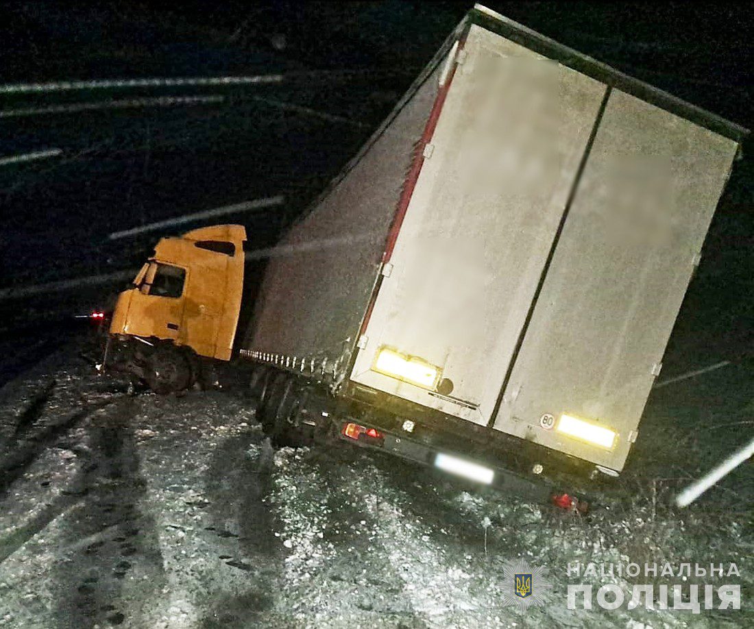 «Близько 23:50 10 грудня водійка автомобіля «Skoda Octavia», 27-річна жителька Вінниччини, здійснюючи рух з другорядної дороги на перехресті, допустила зіткнення з автопоїздом «Volvo» під керуванням 34-річного жителя Закарпаття. У результаті ДТП водійка та пасажир легковика, 23-річний житель Вінницької області, отримали травми та були доставлені до травмпункту Бердичівської міської лікарні. Водій вантажівки не постраждав», ‒ розповіли у поліції.