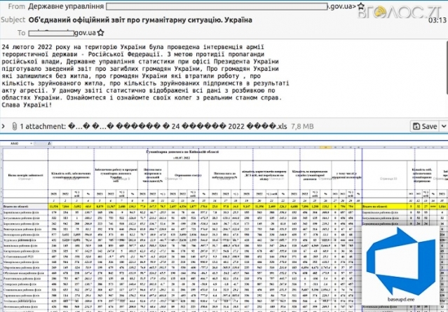 «Листи надходять зі скомпрометованих електронних адрес державних органів України та містять вкладення у вигляді XLS-документа з назвою «Гуманітарна катастрофа України з 24 лютого 2022 року.xls», ‒ йдеться у повідомленні.