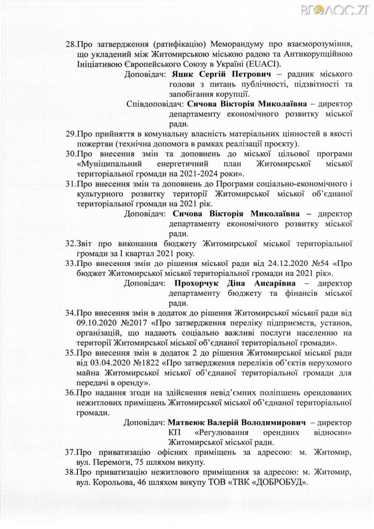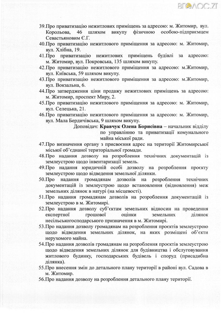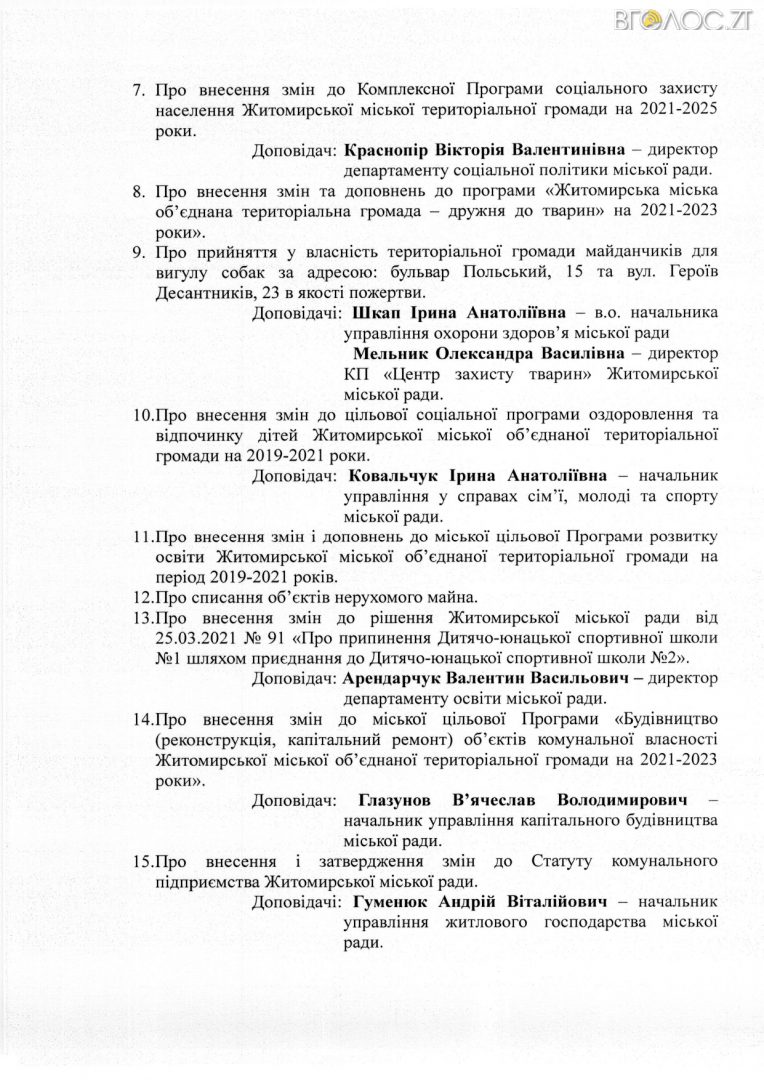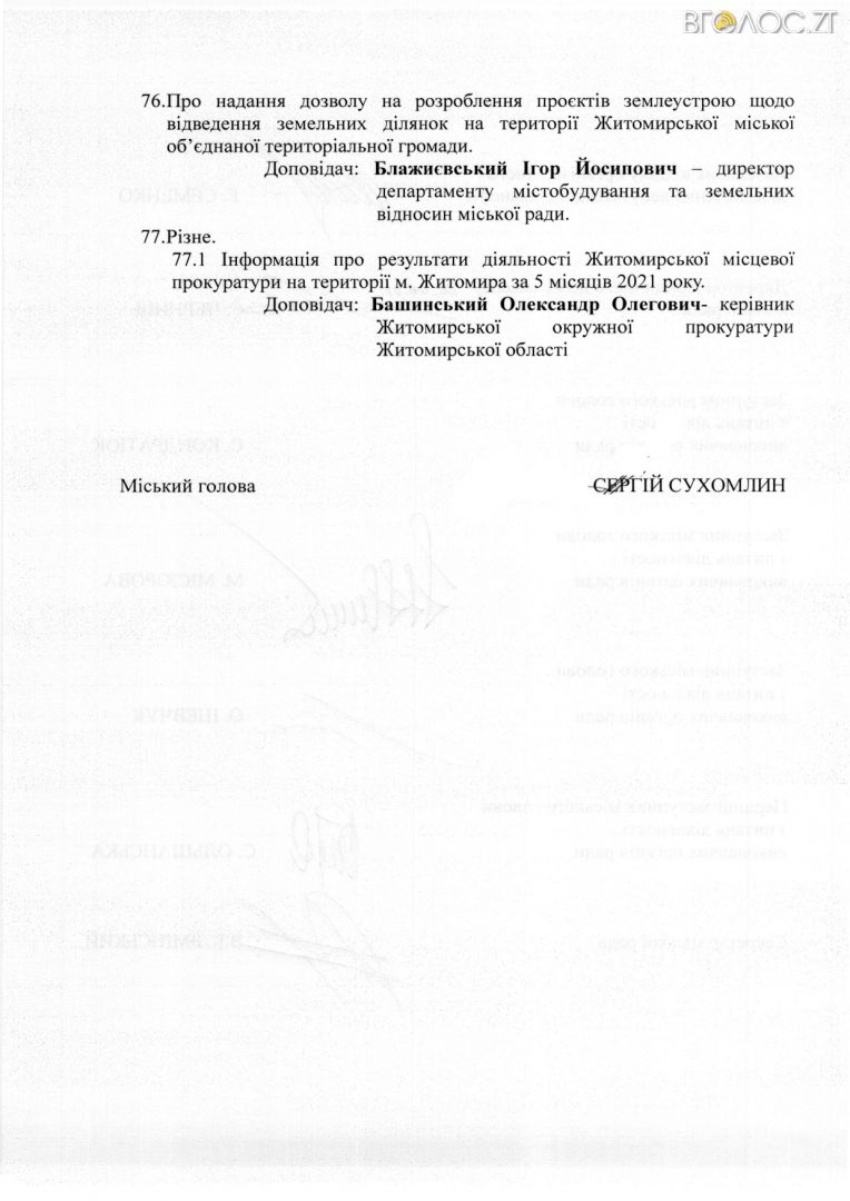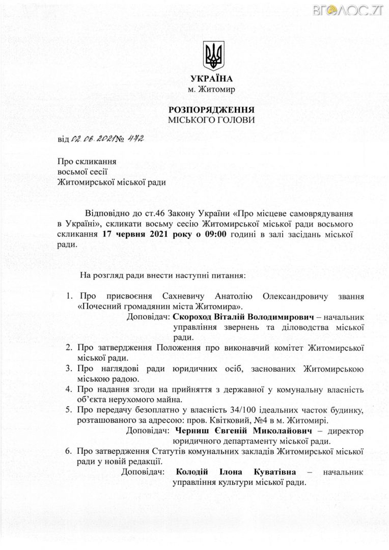 Сесія Житомирської міської ради відбудеться 17 червня. У ході засідання депутати розглянуть 77 питань. Відповідне розпорядження міський голова Сергій Сухомлин підписав 2 червня.