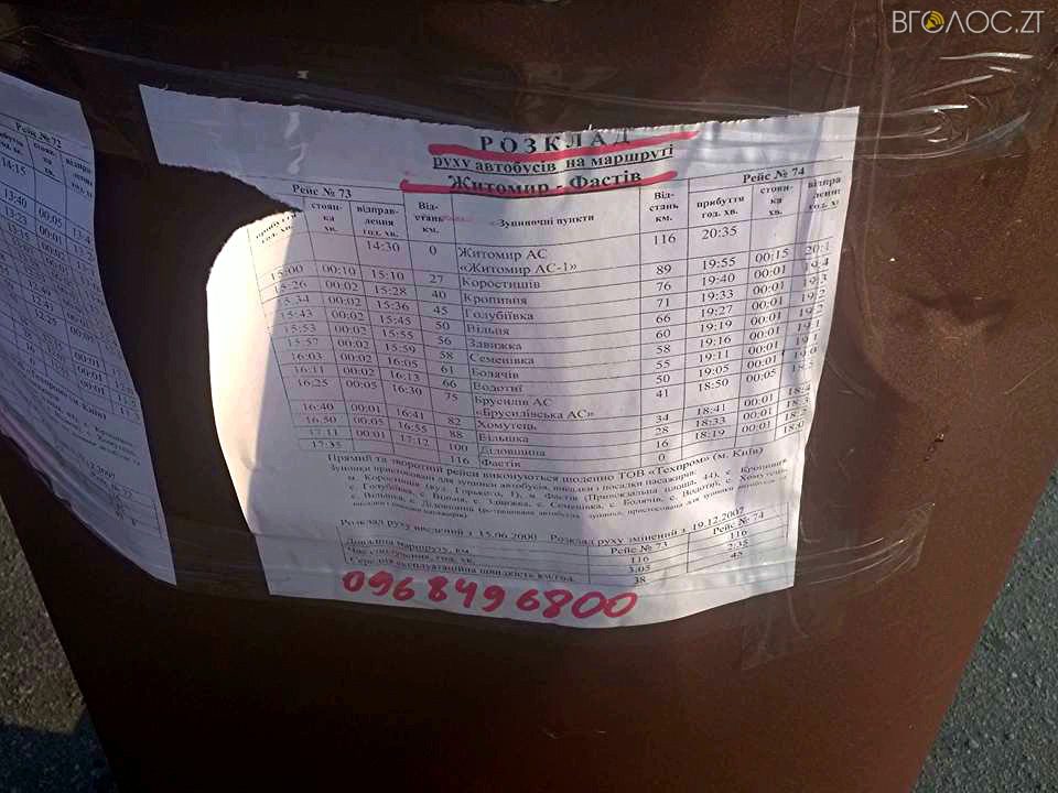У Коростишеві на урнах для сміття один із перевізників розмістив розклад руху автобусів, які курсують  маршрутом “Житомр-Фастів”. Про це на своїй сторінці у «Facebook» повідомила місцева жителька Ірина Козіянчук.