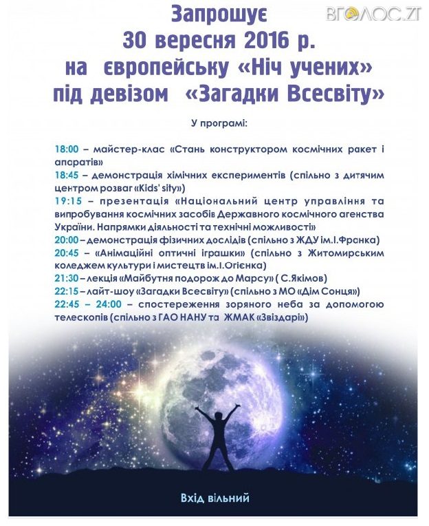 У Музеї космонавтики ім. С .П. Корольова 30 вересня з 18:00 до 24:00 год. проведуть європейську «Ніч учених» під девізом «Загадки Всесвіту», – про це повідомили організатори заходу – Музей космонавтики та громадська організація «Асоціація музеїв космонавтики України».