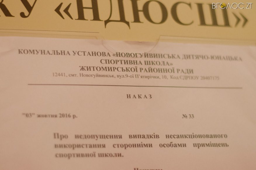 Близько сотні жителів селищ Новогуйвинське, Озерне та Гуйва зібралися 7 жовтня у спортивній залі комунальної установи «Новогуйвинська спортивна школа» Житомирської районної ради. Ініціатором зборів стала адміністрація закладу, який через непорозуміння із селищною радою можуть залишити простонеба.