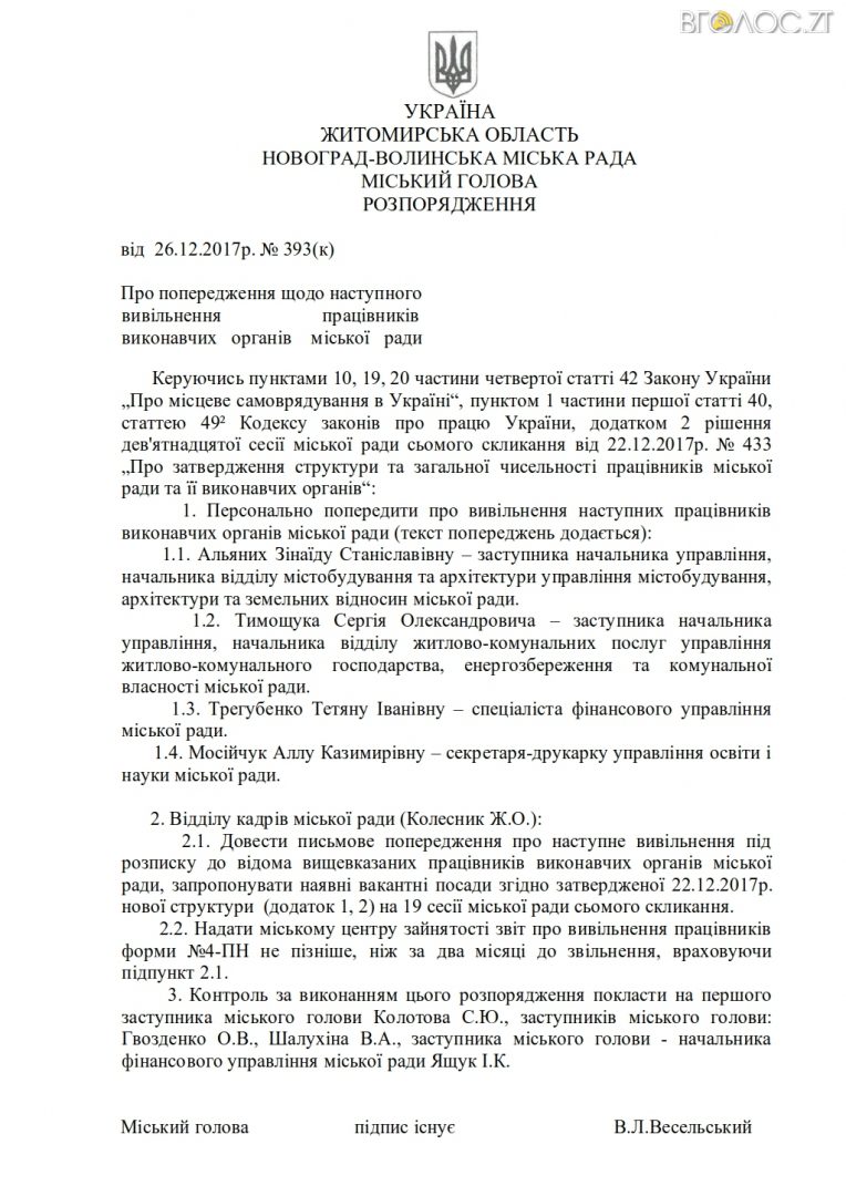 Рішення про зміну чисельності працівників Новоград-Волинської міської ради депутати прийняли під час сесії 22 грудня. Розпорядження про приведення штату міськради у відповідність до прийнятого рішення та попередження працівників, яких буде звільнено, міський голова Новограда-Волинського підписав 26 грудня.