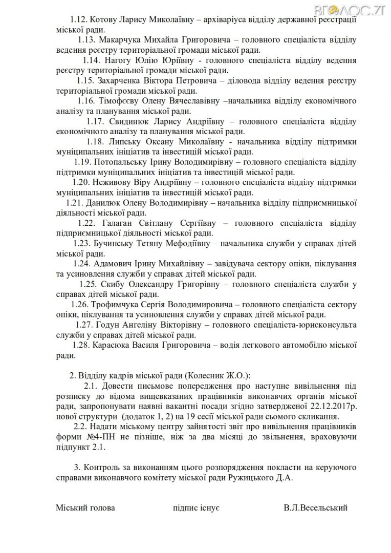 Рішення про зміну чисельності працівників Новоград-Волинської міської ради депутати прийняли під час сесії 22 грудня. Розпорядження про приведення штату міськради у відповідність до прийнятого рішення та попередження працівників, яких буде звільнено, міський голова Новограда-Волинського підписав 26 грудня.
