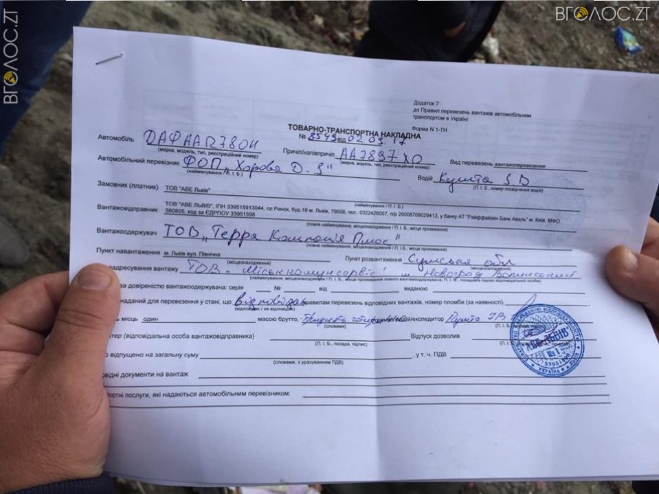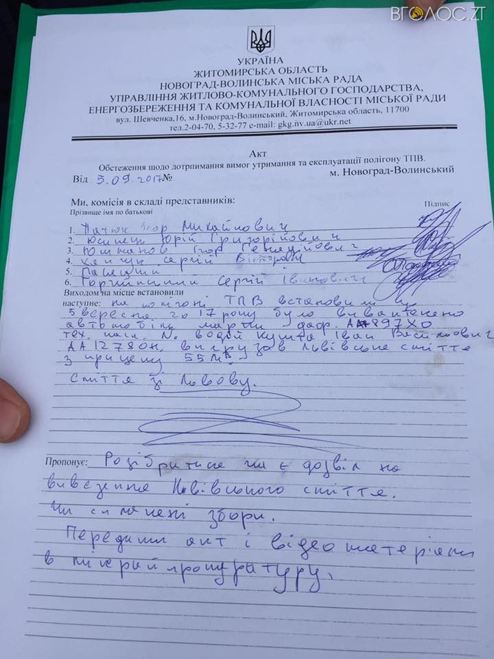 «Факти підтвердили підозри, що на Новоград-Волинський полігон твердих побутових відходів надходить сміття з інших регіонів. При цьому Новоград-Волинська міська рада ніяких договорів на прийом сміття не укладала. Зокрема, сьогодні, 5 вересня, комісією в складі депутатів міської ради Ігоря Юшманова, Олександра Палецького і Сергія Хапчука, а також представників УЖКГ, включаючи директора КП Шляхрембуд Юрія Юсипця, було зафіксоване скидання декількох десятків тонн сміття вантажним автомобілем з номерними знаками АА 1278 ОН, який належить ФОП Д. І. Хорова. Водій автомобіля І. В. Кушта. Даний факт зафіксовано та задокументовано належним чином», – написав депутат.