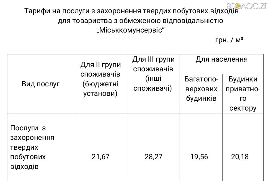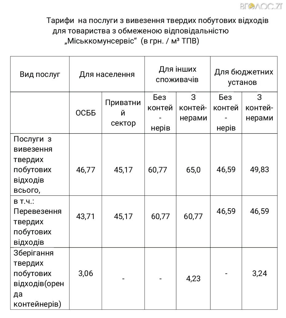 Зокрема, послуга з вивезення твердих побутових відходів за 1 м³ для ОСББ становитиме 46 грн 77 коп., а для приватного сектору – 45 грн 17 коп. Бюджетні установи платитимуть від 46 грн 59 коп. до 49 грн 83 коп. за 1 м³. Для інших споживачів тариф становитиме від 60 грн 77 коп. до 65 грн.