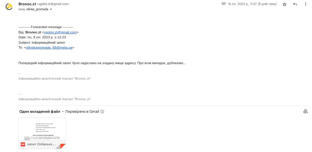Перший запит щодо зазначених питань «Вголос.Zt» направив на електронну адресу керівництва Оліївської сільської ради, вказаної на їхньому сайті ще 9 січня. За тиждень, 16 січня, його було продубльовано на загальну пошту сільради. Однак і на нього відповіді не надійшло. Попри те, що законом встановлені чіткі вимоги щодо термінів розгляду інформаційних запитів та відповіді на них.