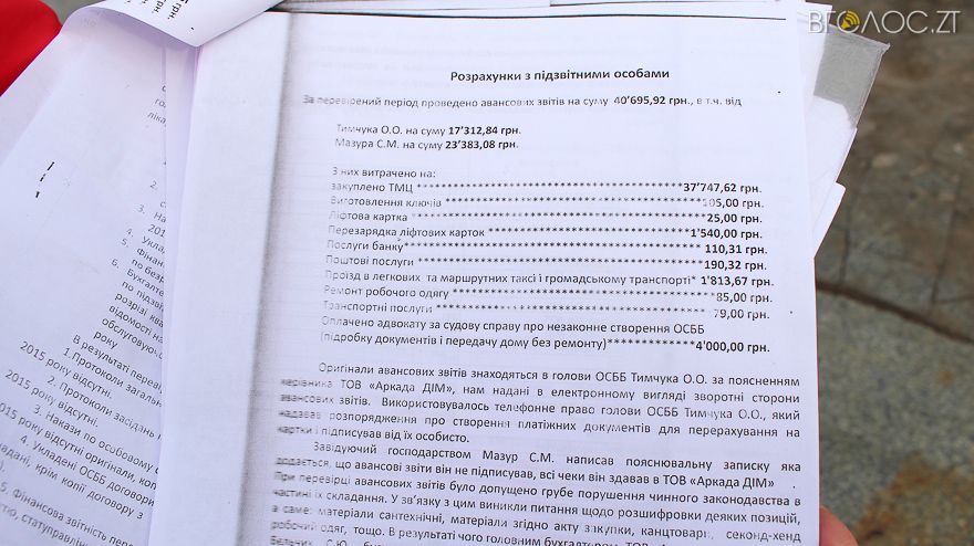 Голова ревізійної комісії ОСББ “Малікова-16” Віктор Скиба зазначив, що за актами перевірки виявилось, що Олександр використовував гроші мешканців будинку не за призначенням. За його словами, Тимчук обіцяв працювати на громадських засадах, проте все ж нараховував собі зарплатню, виділяв кошти на проїзд, велику кількість канцелярії і на неіснуючі ремонти.