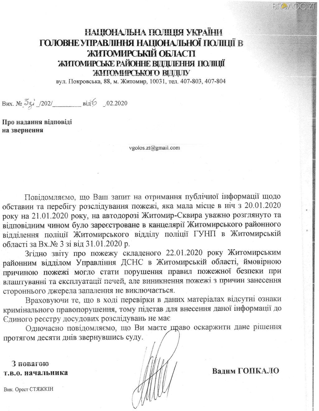 «Згідно зі звітом про пожежу, складеним 22 січня 2020 року Житомирським райвідділом Управління ДСНС, ймовірною причиною загоряння могло стати порушення правил пожежної безпеки при влаштуванні та експлуатації печей», ‒ йдеться у повідомленні.