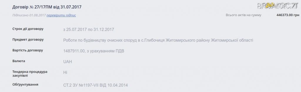 Роботи виконує житомирська фірма «Укрбіотал-монтаж». Її керівником є житомирянин Сергій Тетеря. У вересні за виконані підприємством роботи Глибочицька сільська рада вже заплатила фірмі 446 тис. 343 грн.