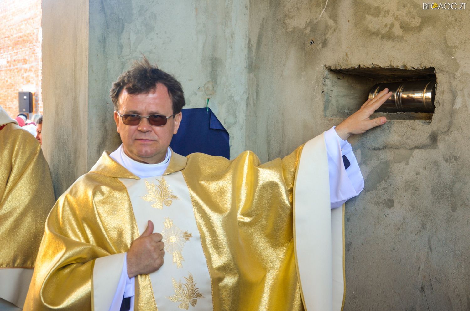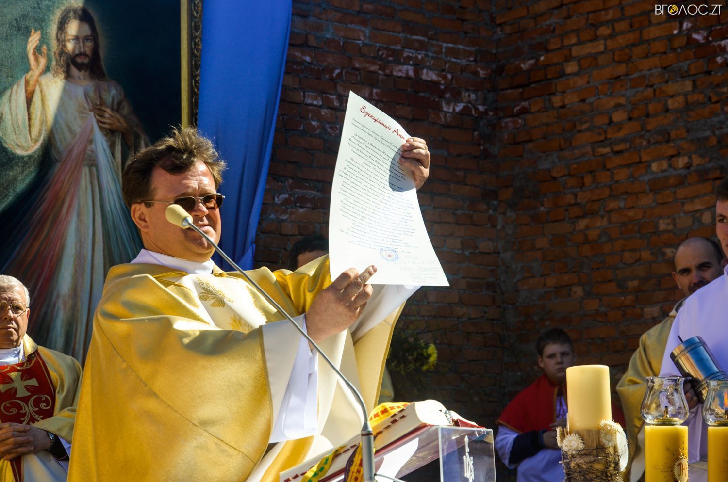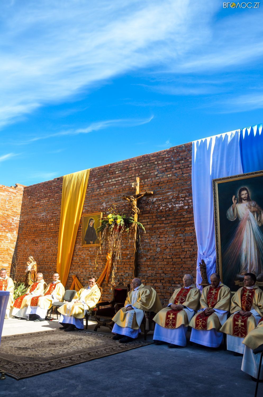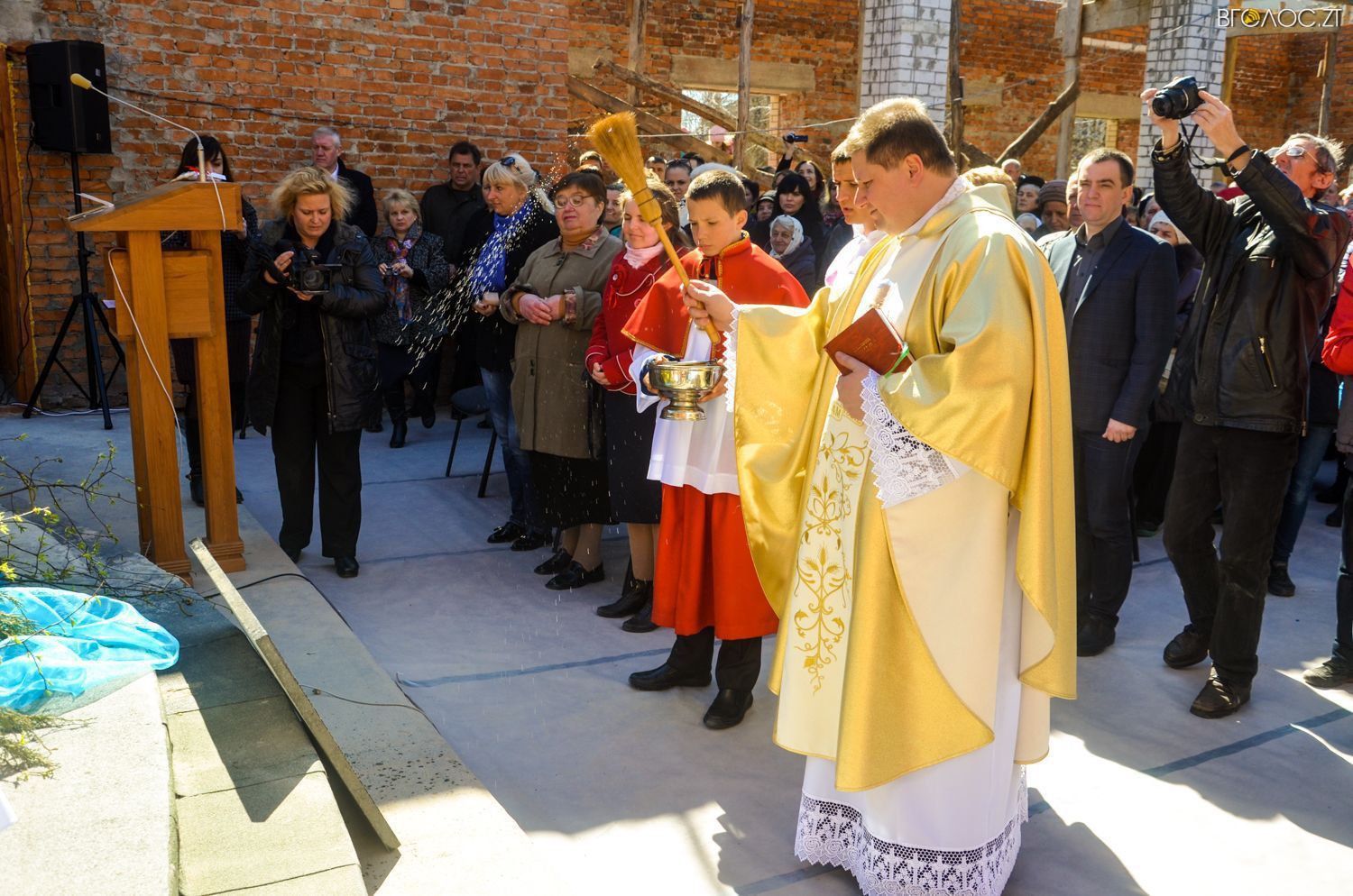 Перед тим, як вмурувати наріжний камінь, який був привезений з Гори Голгофи, настоятель о. Ярослав Ольшевський прочитав ерекційний акт, який підписали представники отці-паллотини, прихожани та активні парафіяни, які докладали зусиль до відновлення та відродження храму.
