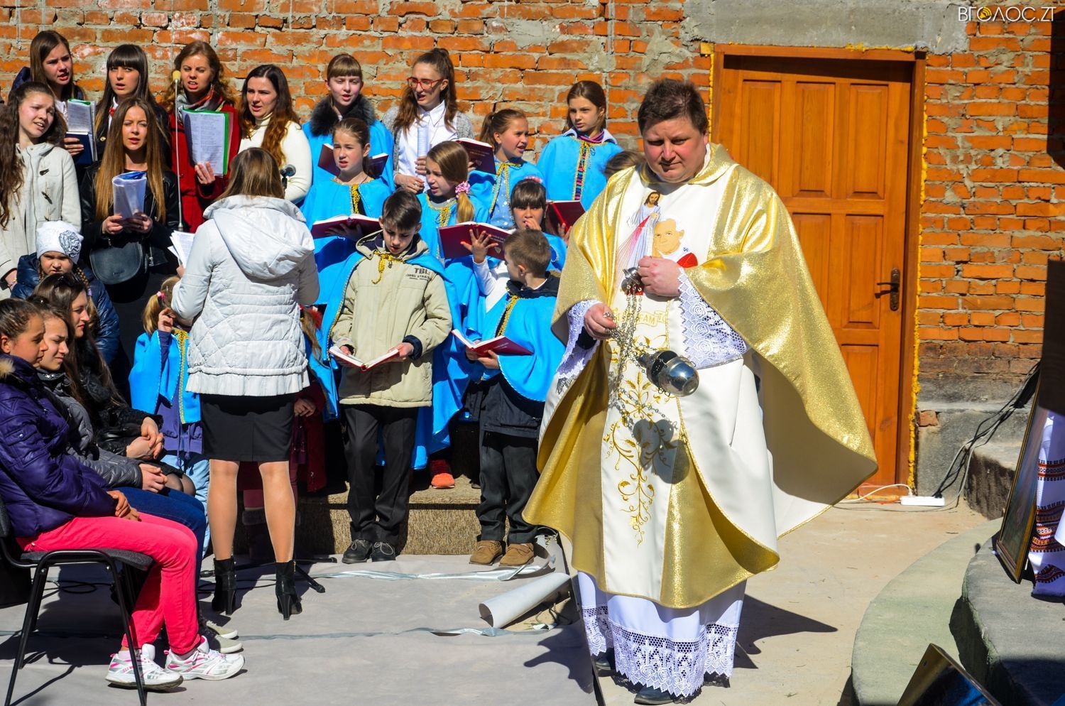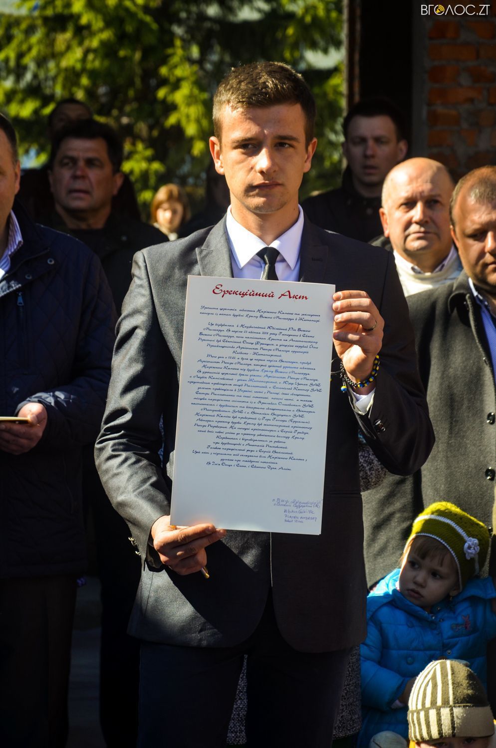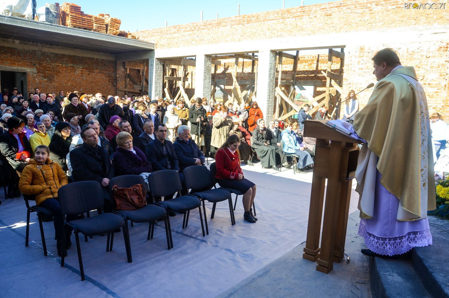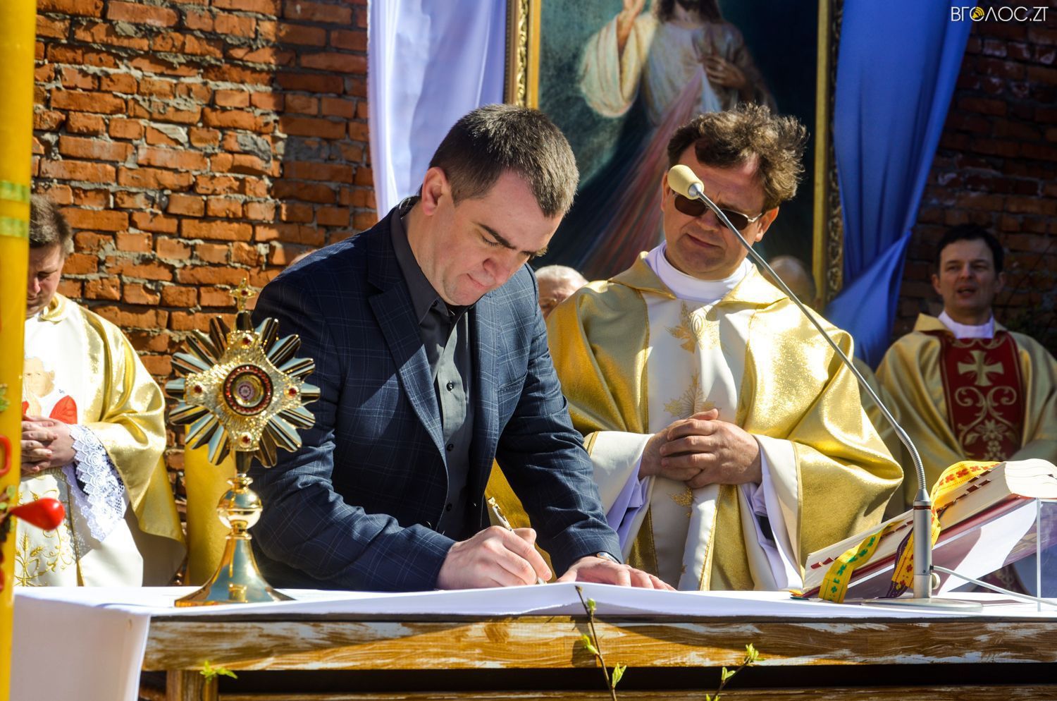Перед тим, як вмурувати наріжний камінь, який був привезений з Гори Голгофи, настоятель о. Ярослав Ольшевський прочитав ерекційний акт, який підписали представники отці-паллотини, прихожани та активні парафіяни, які докладали зусиль до відновлення та відродження храму.
