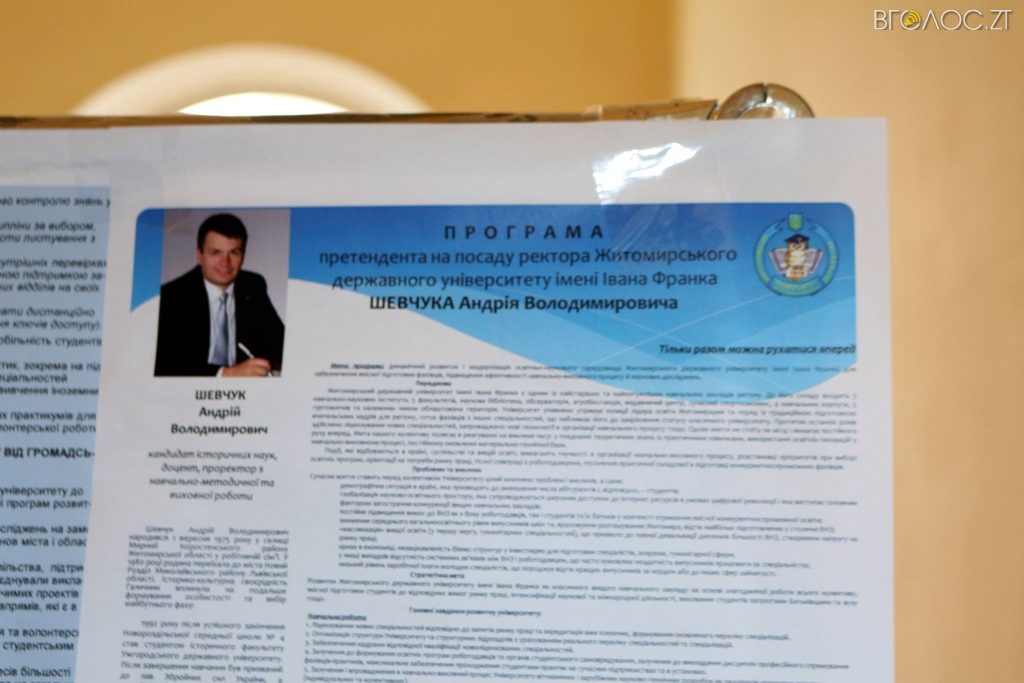 У приміщені ЖДУ імені Івана Франка 12 жовтня відбулися вибори ректора університету. На цю посаду претендують 5 кандидатів. Голосування тривало з 9:00 до 15:00. Переможця обіцяють оголосити о 18:00. За прозорістю процесу слідкує виборча комісія.