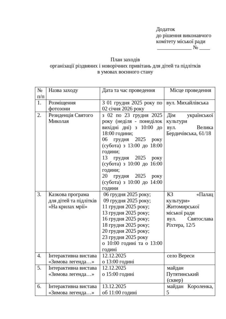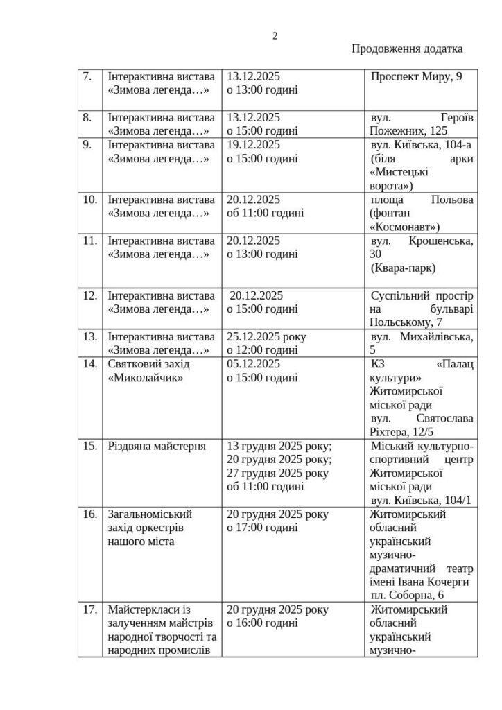 У 10 локаціях в різних районах Житомира та селі Вереси 12, 13, 19, 20 та 25 грудня відбуватиметься інтерактивна вистава «Зимова легенда». Також для житомирських дітлахів у міському палаці культури буде організовано святкову виставу. Вона відбуватиметься 6, 9, 11, 13, 16, 18, 20 та 23 грудня о 10:00 та 13:00.