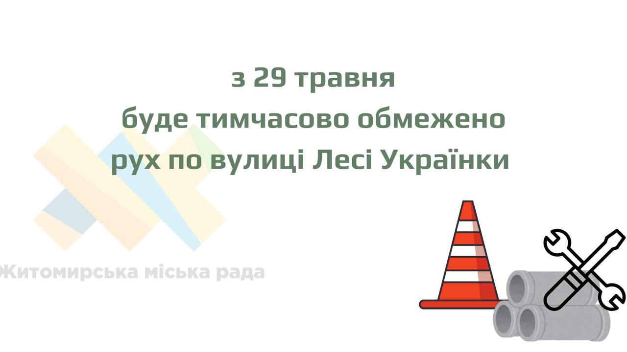У Житомирі з 29 травня буде перекрито рух по вулиці Лесі Українки від вулиці Юрка Тютюнника до Покровської. Про це повідомили у прес-службі міської ради.