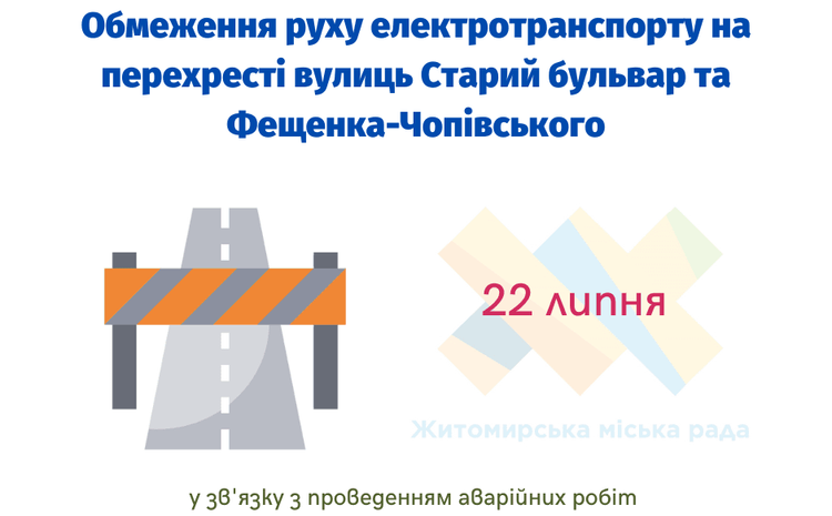 У Житомирі 22 липня обмежать рух електротранспорту по Старому бульвару та вулиці Фещенка-Чопівського. Про це повідомили на КП «Житомирводоканал».