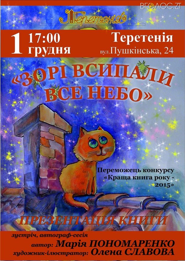 Поспілкуватися з автором та ілюстратором, придбати для своєї дитини незвичайну книгу, отримати автограф, а також дізнатись про плани на майбутнє можна буде 1 грудня о 17:00 год. в кав’ярні-кондитерській «Теретенія». Вхід вільний.