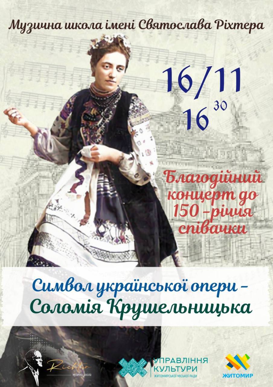 У житомирській музичній школі імені Святослава Ріхтера 16 листопада пройде благодійний концерт до дня народження Соломії Крушельницької. Про це повідомили в управлінні культури Житомирської міської ради.
