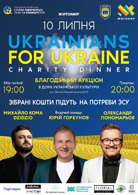 «Благодійний захід відбудеться 10 липня в Домі української культури за адресою Велика Бердичівська 61/18. Триватиме захід з 19:00 до 22:00. Ведучим вечора буде Юрій Горбунов, запрошені зірки – Олександр Пономарьов та Михайло Хома (DZIDZIO)», – кажуть у мерії.