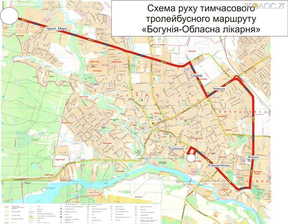 “У зв’язку з проведенням ремонтних робіт по вул. Перемоги, 01.08.2019 року тролейбусні маршрути №2,3,5-а,7,10 буде скасовано, на період проведення ремонтних робіт організовано роботу тролейбусного маршруту «Богунія – проспект Незалежності – вул.Східна – вул.Київська – вул. Вітрука-вул.В.Бердичівська-Обл.Лікарня» та в зворотному напрямку (схема додається).