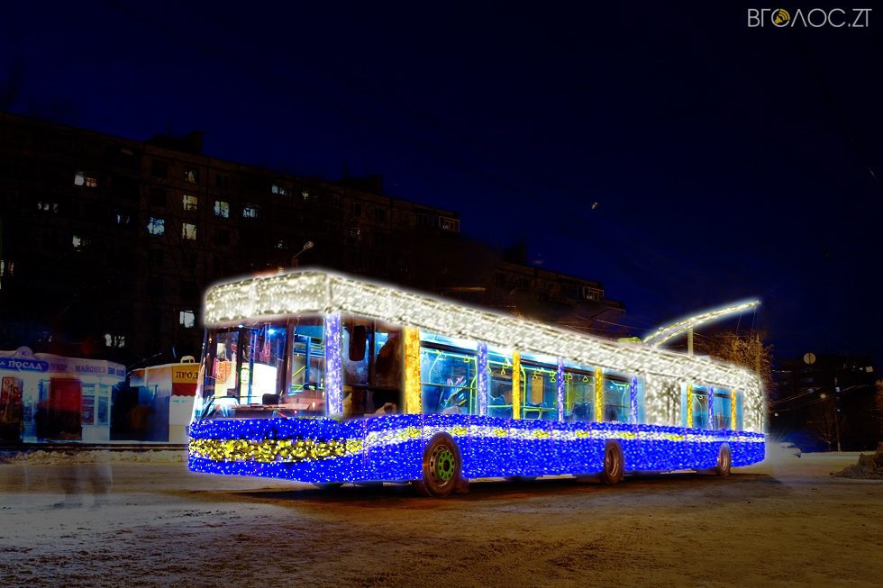 У Житомирі у новорічну ніч містом курсуватимуть тролейбуси за спеціальною схемою, яка відрізнятиметься від звичайних днів. Крім того, тролейбуси курсуватимуть містом з 23:00 до 3:00 години. Про це повідомила прес-служба міської ради.