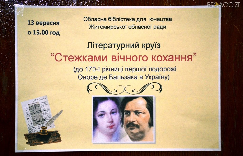 У приміщенні Житомирської обласної бібліотеки для юнацтва 13 вересня відбувся літературний круїз “Стежками вічного кохання”. Захід приурочений до 170-ї річниці першої подорожі Оноре де Бальзака в Україну. Гості бібліотеки почули історію кохання великого французького письменника Оноре де Бальзака і графині Евеліни Ганської. Окрім того, присутні мали змогу ознайомитися з фрагментами листування Бальзака з Евеліною Ганською.