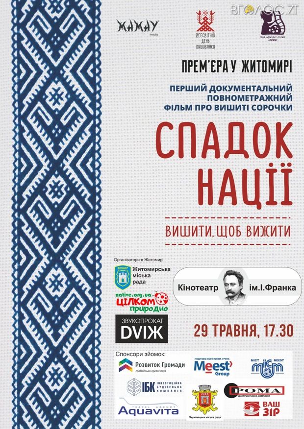 В обласному центрі у неділю, 29 травня, о 17:30 год. у кінотеатрі ім. І. Франка відбудеться прем’єрний показ першого повнометражного документально фільму про вишиті сорочки «Спадок нації». Про це повідомили організатори показу.