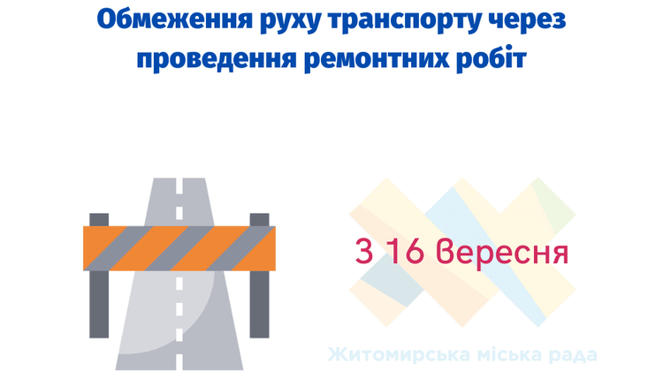 У Житомирі з 16 вересня буде тимчасово обмежено рух транспорту від перехрестя вулиць Перемоги та Лесі Українки до перехрестя вулиць Юрія Тютюнника та Лесі Українки. Про це повідомили у пресслужбі міської ради.