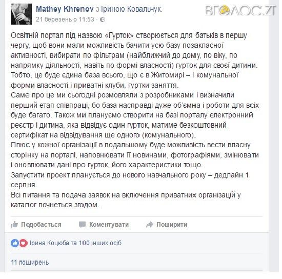 У Житомирі планують створити для батьків освітній портал під назвою «Гурток». Про це на своїй сторінці у Facebook написав заступник міського голови Матвій Хренов.