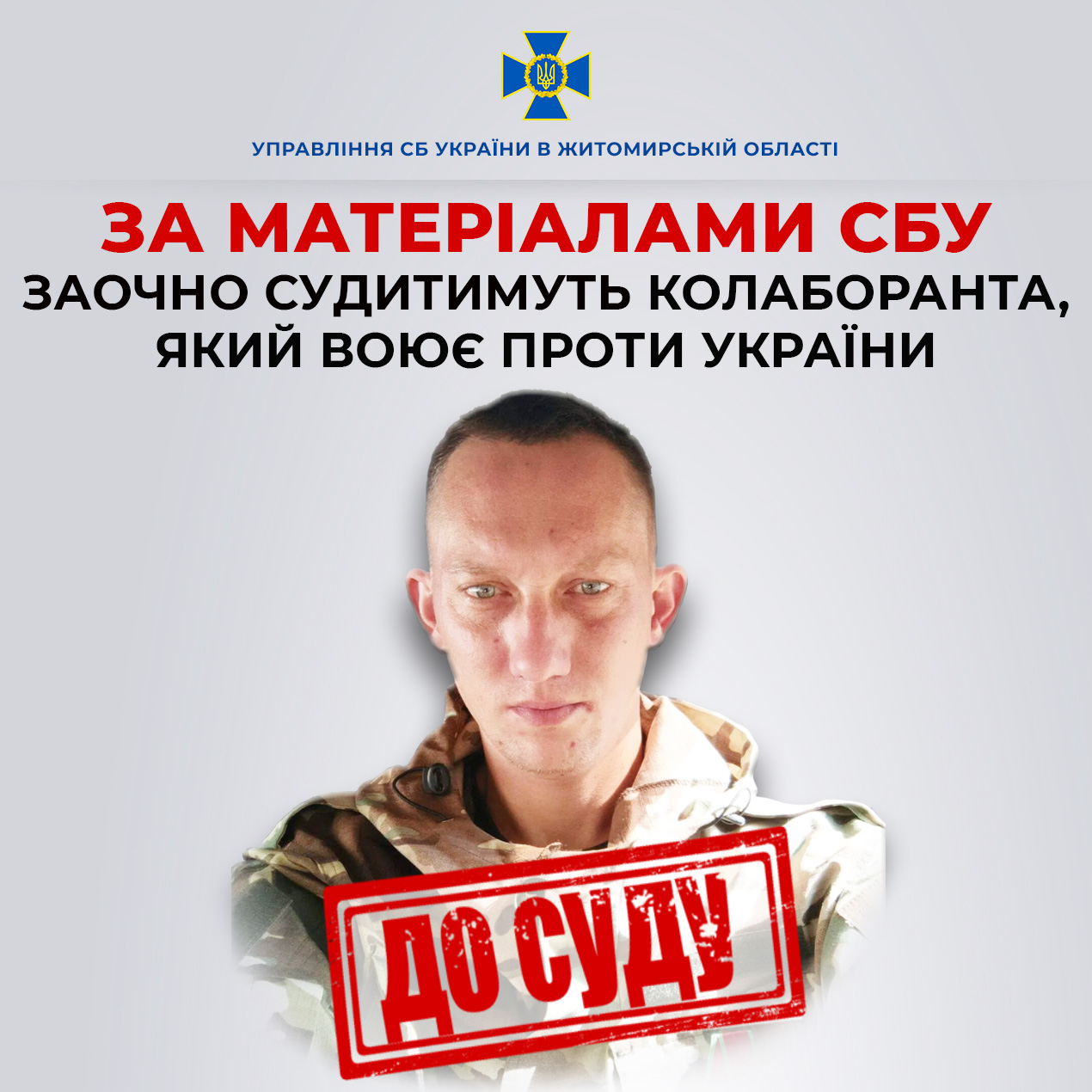 У Житомирі судитимуть колаборанта з Луганщини, який після повномасштабного вторгнення присягнув на вірність державі-агресору та воює проти власної країни на Придніпровському напрямку. Про це повідомили у пресгрупі УСБУ у Житомирській області.