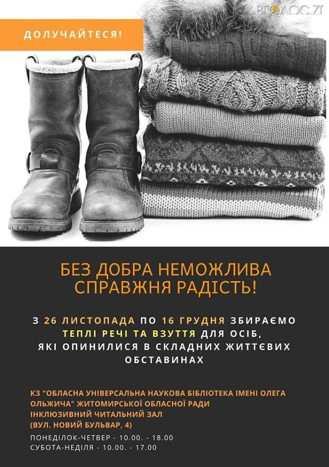“Теплий одяг та взуття для потреб людей, що опинилися у складних життєвих обставинах, збирають у Житомирі. Благодійна акція триватиме з 26 листопада по 16 грудня. Зібрані речі можна приносити в інклюзивний читальний зал Житомирської обласної універсальної наукової бібліотеки імені Ольжича (вул. Новий Бульвар, 4) по буднях з 10.00 -18.00, у вихідні – з 10.00-17.00”, – йдеться у повідомленні.