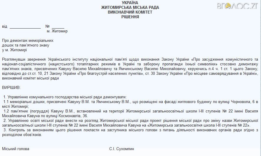 Колишні перший секретар Житомирського обкому КПУ Василь Кавун та голова Житомирського обласного виконавчого комітету Василь Ямчинський, за інформацією автора проекту рішення, підпали під декомунізацію.