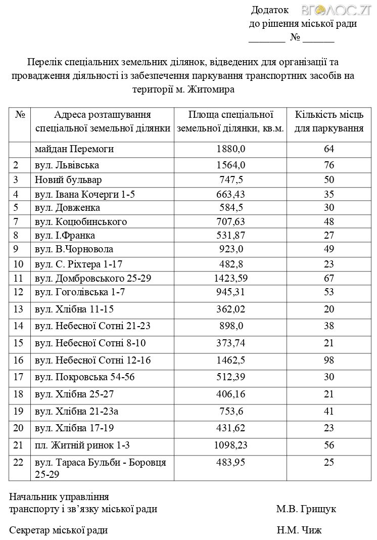 «Внести зміни в п. 2.2. рішення міської ради від 03.03.2011 №61 «Про вставлення податків та зборів на території м. Житомира відповідно до Податкового кодексу України, а саме затвердити перелік спеціальних ділянок, відведених для організації та впровадження діяльності із забезпечення паркування транспортних засобів, у новій редакції згідно з додатком», – йдеться у документі.