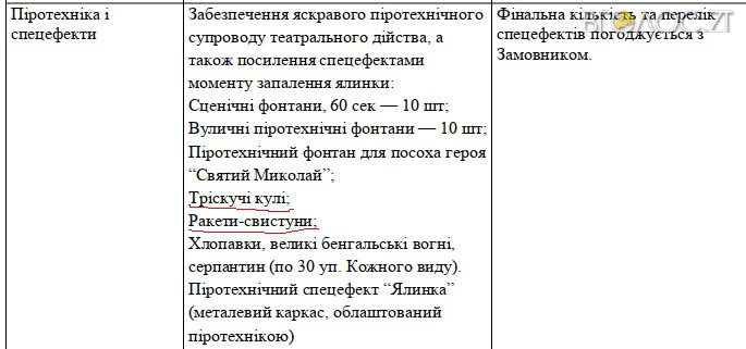 Тим часом, у тендерній документації до святкування Нового року прописане використання ракет-свистунів та тріскучих куль. Перші становлять собою ракети, які підпалюються від ґніту, злітають в небо і видають гучний оглушливий свист. Тріскучі кулі становлять собою фактично той самий салют. Згідно із даними виробника, це різнокольорові кулі із тріскучим хвостом, які злітають на висоту до 20 метрів і розсипаються за принципом того ж салюту чи феєрверку.