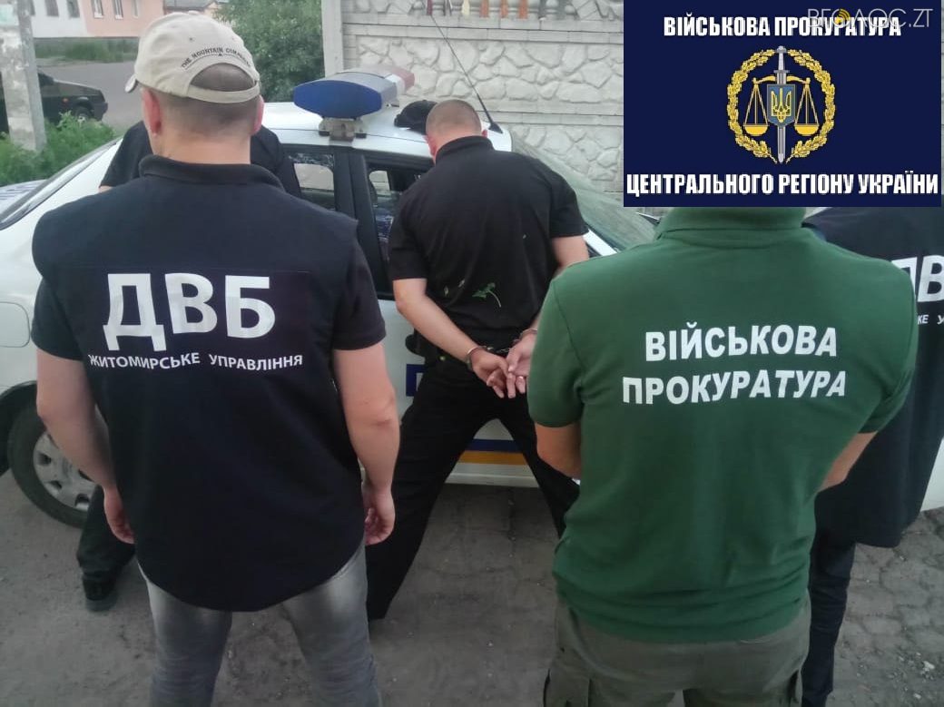 За процесуального керівництва військової прокуратури Житомирського гарнізону Центрального регіону України слідчими слідчого відділу УСБУ в Житомирській області спільно із співробітниками відділу ВБКОЗ Управління СБУ в Житомирській області та Управління внутрішньої безпеки Житомирської області ДВБ Нацполіції під час отримання неправомірної вигоди викрито та затримано поліцейського сектору реагування патрульної поліції Житомирського районного відділення поліції.