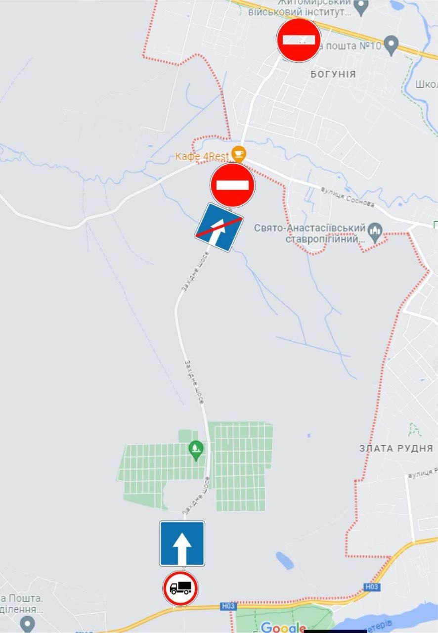 від Чуднівського шосе → у напрямку Богунії (до вул. Соснової)