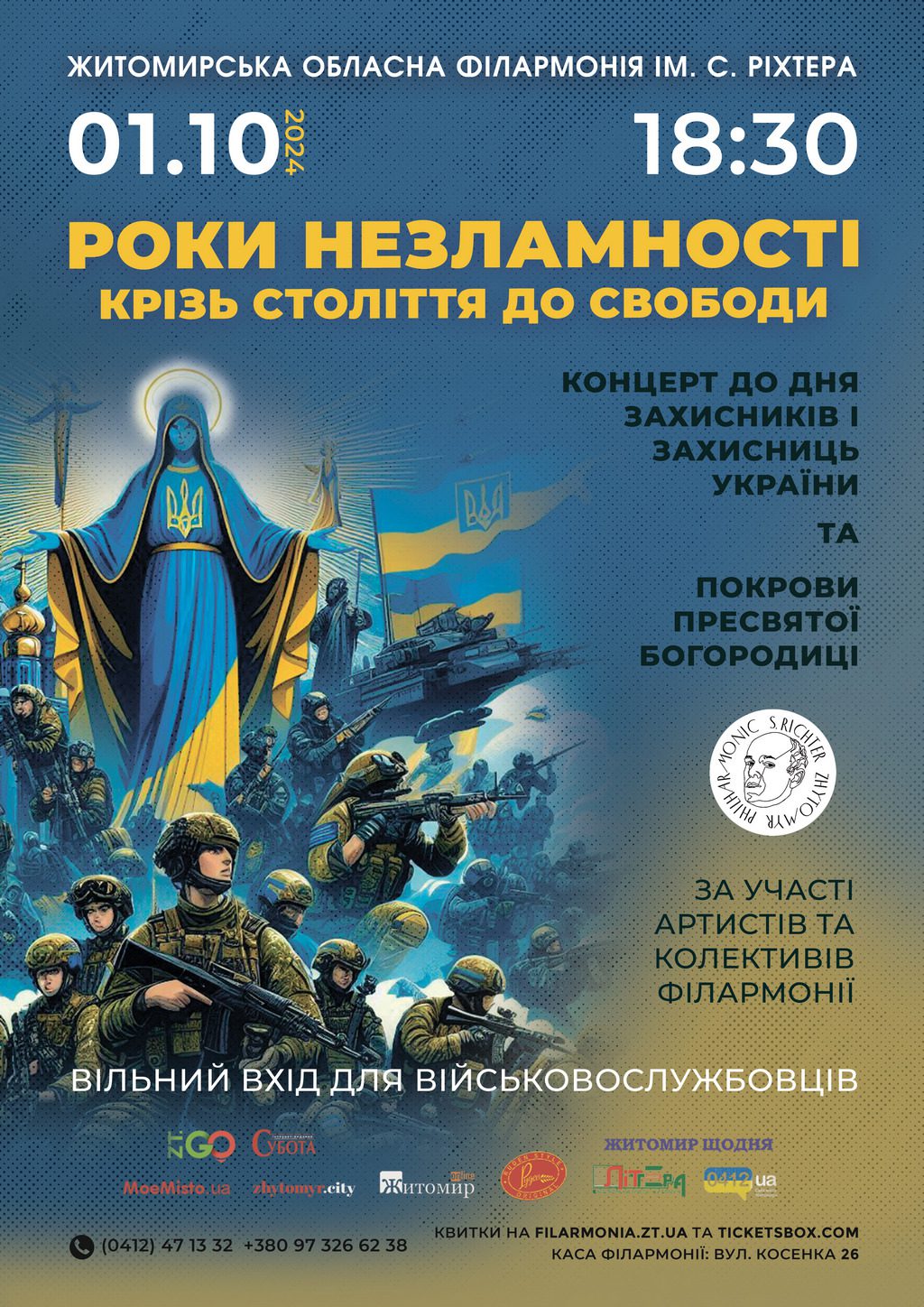 Запрошуємо вас 1 жовтня о 18:30 до Житомирської обласної філармонії ім. С. Ріхтера на особливий концерт «Роки незламності: крізь століття до Свободи» присвячений героям, які щодня борються за наше мирне небо, а також Покрові Пресвятої Богородиці — покровительці українських воїнів.