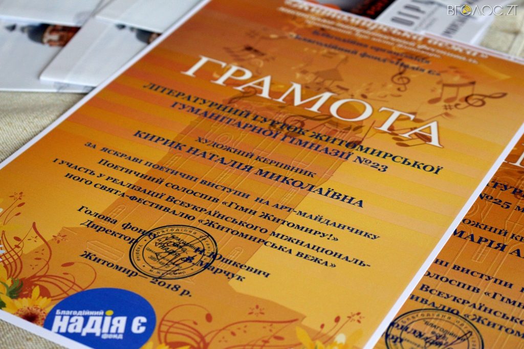 У Житомирській обласній філармонії ім. С. Ріхтера 8 вересня відбувся мистецько-патріотичний фестиваль талановитих дітей та молоді «Житомирська вежа». Вже п’ятий рік поспіль організовує фестиваль благодійний фонд «Надія Є». У заході взяли участь вокалісти, музиканти, хореографічні колективи та майстри художнього слова.